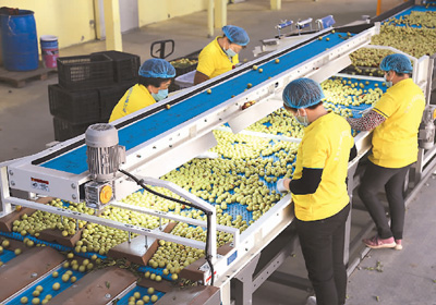 沾化区玉华果蔬进出口有限公司的车间内,工人正在分拣冬枣。