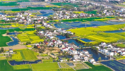 安徽省铜陵市义安区西联镇犁桥村,竞相绽放的油菜花与乡村公路构成了美丽的生态田园画卷。